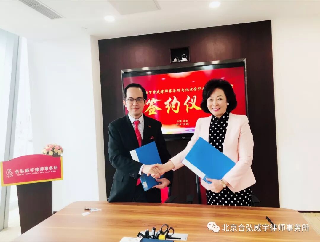 十月的北京秋高气爽,合弘威宇律师事务所好讯频传。10月28日马来西亚的马中律师联合会罗章武会长亲临我所,与我所张巍主任就互设办事处事宜进行了亲切交谈并签署了合作协议,这标志着我所又一家海外办事处正式设立。