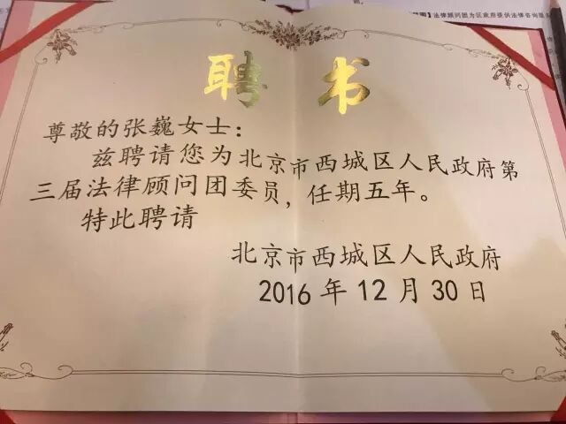最后,副区长李异同志指出:随着改革的不断深化,政府在实际工作中遇到了很多新问题,希望各位委员能够充分发挥专业优势帮助破解难题;不断创新工作方式,紧密结合西城区人口疏解、产业升级等重点、难点问题创新工作方式,组织委员开展相关专题调研工作,形成示范性文件,更好地发挥专家委员的作用;继续把握好工作方向,需要各位委员切实发挥顾问团智囊作用,在宏观层面上为政府出好主意,将自己的专业见解提供给政府,供政府决策参考。 张巍博士被聘为西城区人民政府第三届法律顾问团委员