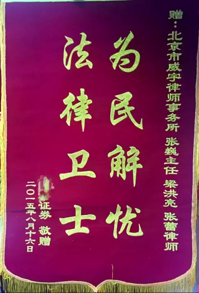 为此,某知名证券公司对梁律师认真的工作态度抱以深深地感谢,赞扬其“为民解忧、法律卫士”,并坚持制作了锦旗以表达自己及公司对梁律师的感激之情。